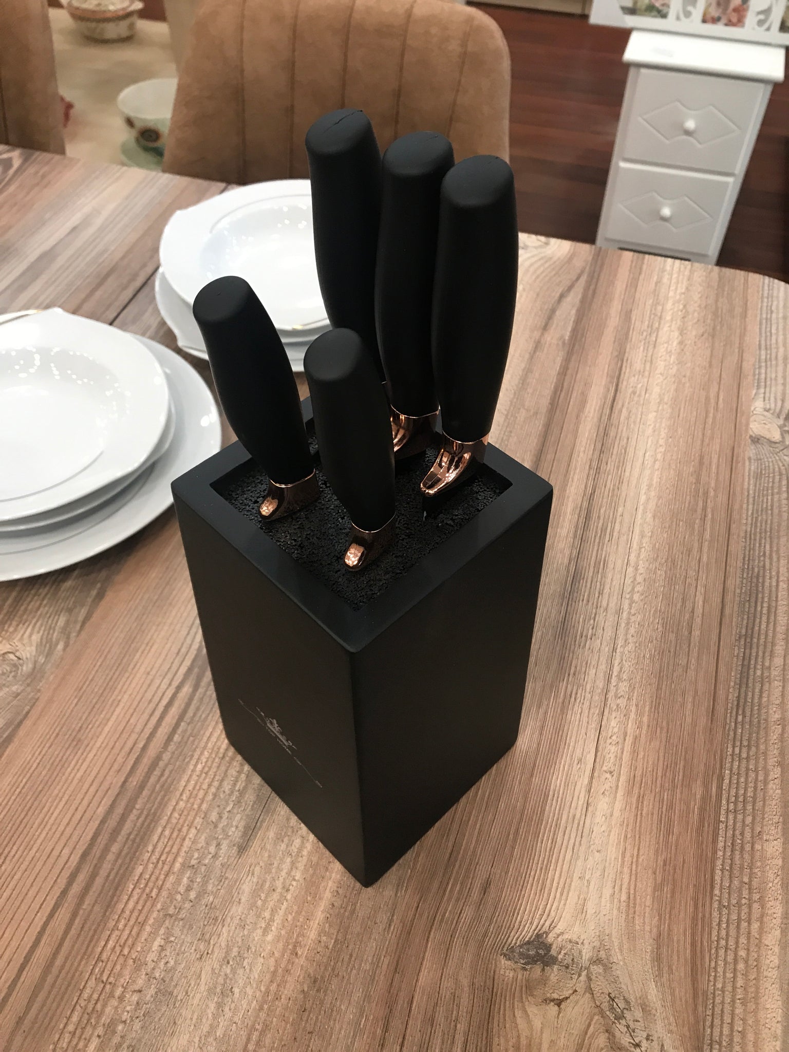 Състои се от поставка и 5 ножа.